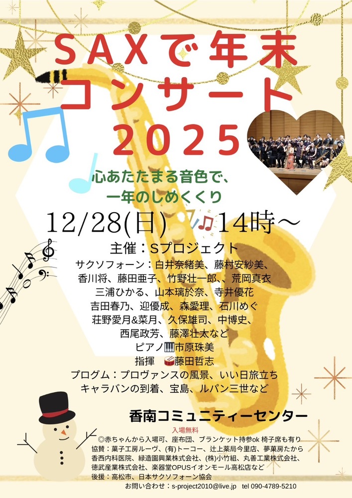 協賛:菓子工房ルーヴ、㈲トーコー、辻上薬局今里店、夢菓房たから、香西内科医院、緑造園興業株式会社、㈱小竹組、丸善工業株式会社、徳武産業株式会社、楽器堂OPUSイオンモール高松店 他